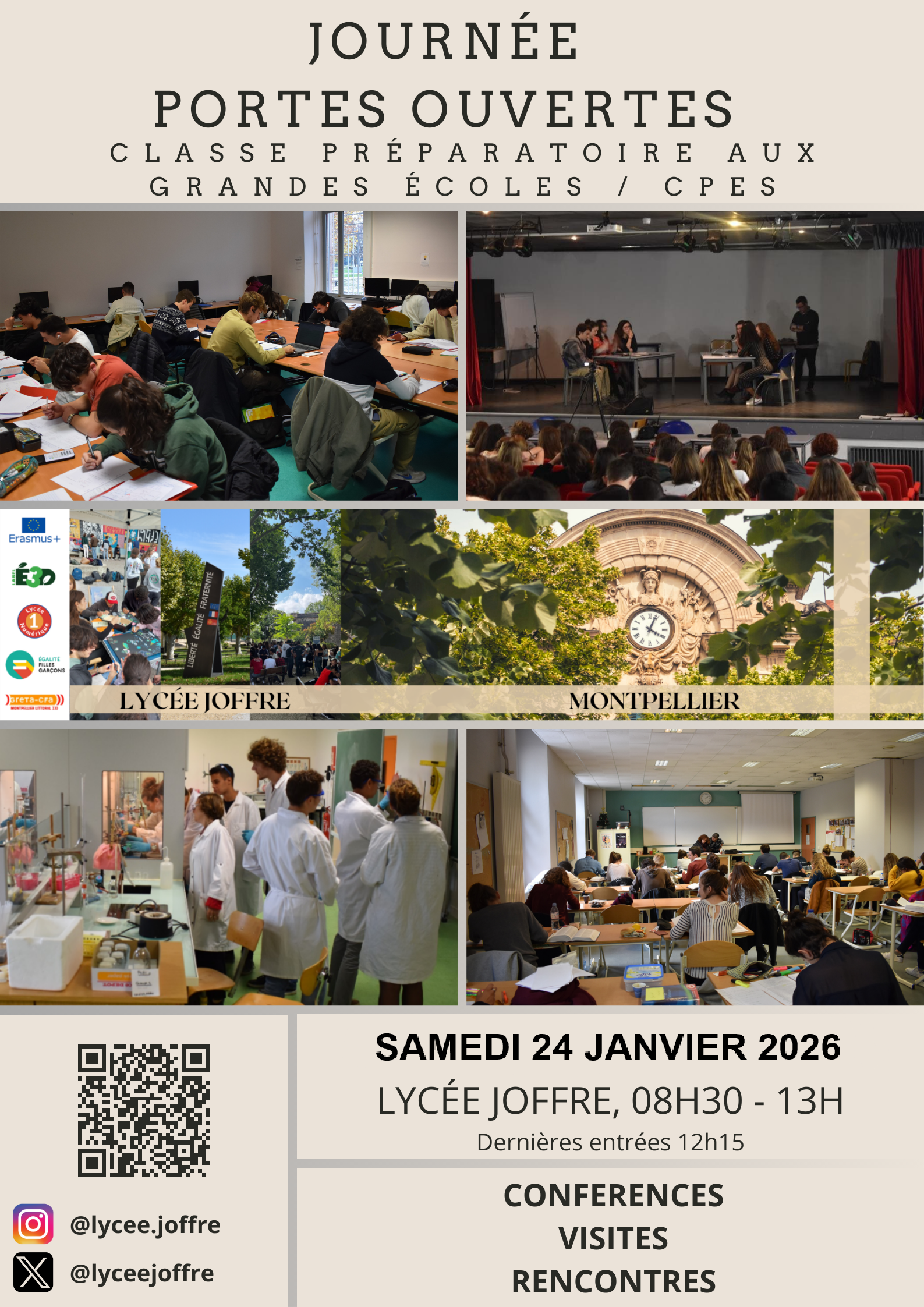La journée portes ouvertes concerne uniquement la partie enseignement supérieur du lycée Joffre (Classes Préparatoires aux Grandes Écoles et Cycle Pluridisciplinaire d'Études Supérieures). Il n'y a pas de journée portes ouvertes dédiée à la présentation des classes de Seconde , Première et Terminale cette année.